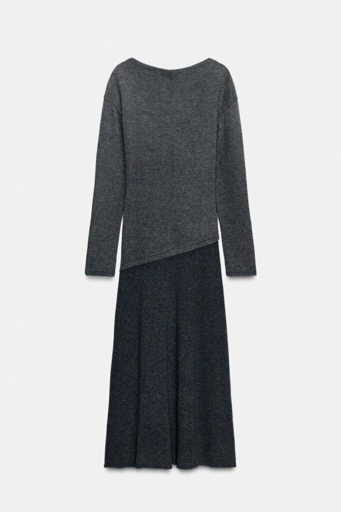 Este vestido, confeccionado en tejido soft, con cuello redondo y manga larga, destaca por el detalle de la combinación de colores y su corte asimétrico en la parte superior. Es una de las ofertas más interesantes que Inditex ha lanzado en estas segundas rebajas y lo mejor es su precio, ya que puede encontrarse por 11,98 euros. Para un conjunto de diario pensado para la oficina resulta una opción ideal, porque los tonos aportan sobriedad y, combinado con botas o mocasines, funciona perfectamente para esa reunión en la que llevas tiempo pensando en pedir una subida de sueldo.