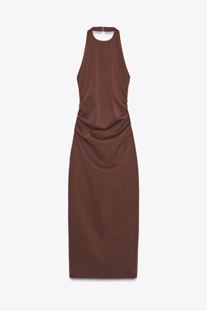 No hay nada más sexy que un vestido de cuello halter, y este modelo lo eleva con su drapeado lateral y espalda descubierta, que lo hacen aún más irresistible. Pero lo mejor de todo es su precio: en Zara lo encuentras por solo 6,39 euros. Es una pieza especial que vale la pena tener a mano para esas quedadas con amigas, perfecta para bailar hasta el amanecer.