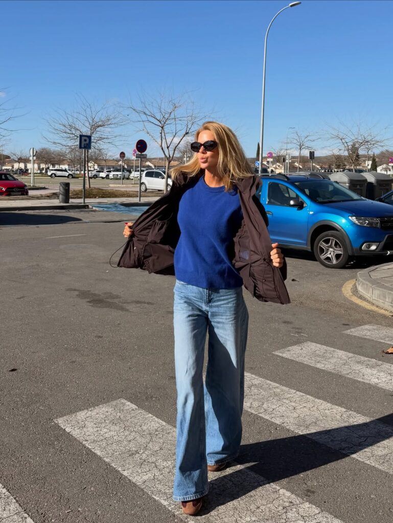 En esta ocasión, Amelia nos muestra que la clave para un armario de oficina funcional y a la moda este invierno puede estar en unos pantalones wide-leg de tiro alto, disponibles en Zara y Mango en rebajas. Este tipo de diseño, con su caída amplia y acampanada, es ideal para estilizar la silueta y aportar movimiento a cualquier outfit. Los combina con un jersey azul eléctrico que aporta un toque de color inesperado y moderno, mientras que unas zapatillas marrón apenas visibles bajo el pantalón aportan comodidad sin sacrificar estilo.
