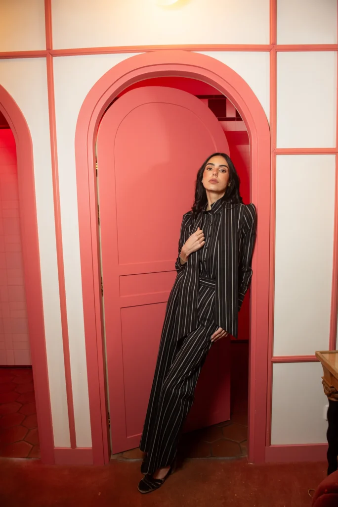 El pantalón a juego, también en algodón, luce un patrón lineal que estiliza y alarga la figura, mientras que el corte equilibra estructura y comodidad. Los botones forrados en el mismo tejido refuerzan la coherencia estética y aportan un acabado elegante que marca la diferencia. Es un conjunto pensado para durar, para moverse con facilidad entre el día y la noche, entre lo formal y lo casual, sin perder nunca la sofisticación.