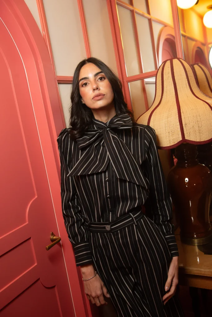 El conjunto que nos ocupa es, simplemente, perfecto. Se trata de una combinación en negro con rayas blancas confeccionada íntegramente en algodón 100%, un tejido que garantiza suavidad, transpirabilidad y una caída impecable. Pero más allá de la calidad del material, lo que lo hace especial es su diseño, que combina estética y funcionalidad de manera brillante. La blusa incorpora una lazada desmontable y versátil que se puede llevar de mil formas: desde un lazo XL muy teatral, hasta una vuelta sencilla, un choker moderno o incluso dejándola caer de manera casual. Ese detalle, aparentemente pequeño, multiplica las posibilidades de estilismo y transforma una sola prenda en varias opciones de look.