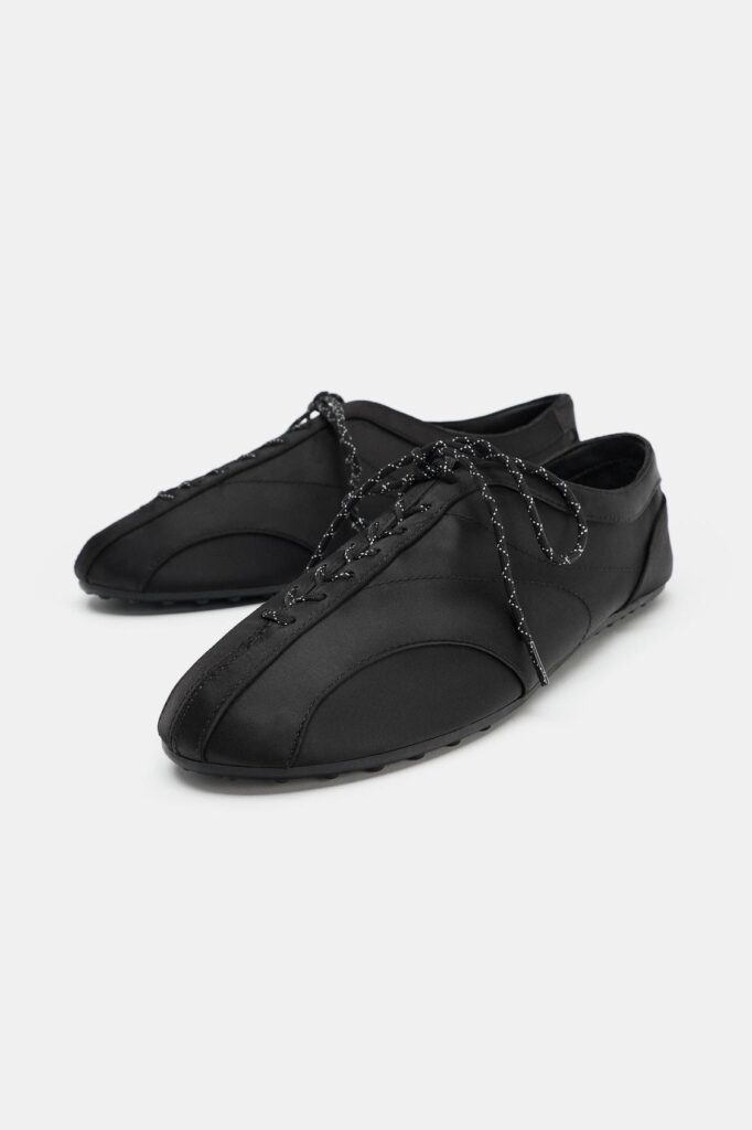 Siguiendo esta línea, desde THE OBJECTIVE hemos localizado la versión de Inditex, concretamente de Zara, que adapta esta tendencia al gran público. La firma lanza modelos ultrafinos en satén, disponibles en tonos como rosa palo y negro, colores que refuerzan ese equilibrio entre delicadeza y modernidad. Según el estilista, en 2026 veremos una clara proliferación de zapatillas en acabados satinados, una apuesta arriesgada pero con enorme potencial estilístico.