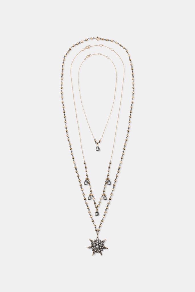 Los collares de Zara se presentan como los detalles que elevan cualquier look. Desde un delicado collar de bolitas metálicas con colgante en forma de estrella, hasta opciones más sutiles como la cadena fina con colgante de cristal, o la combinación de bolitas metálicas y cristales en un diseño ligero y versátil. Cada pieza aporta un toque de brillo y sofisticación minimalista, perfecta para sumar personalidad sin esfuerzo a cualquier outfit.