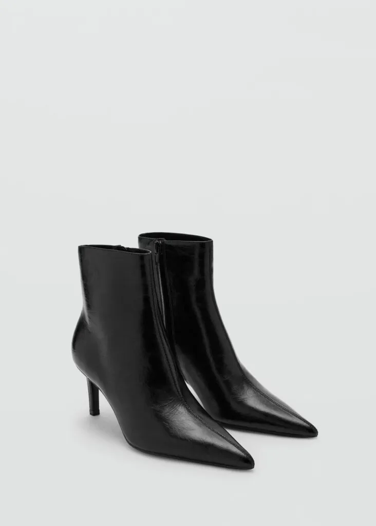 Para culminar el conjunto, unos botines negros de Mango efecto piel con punta afilada y tacón de aguja. La puntera estiliza visualmente la pierna y el tacón eleva la figura, aportando seguridad y elegancia. El negro crea continuidad con el pantalón y la bomber, dejando que el azul eléctrico sea el elemento diferencial.