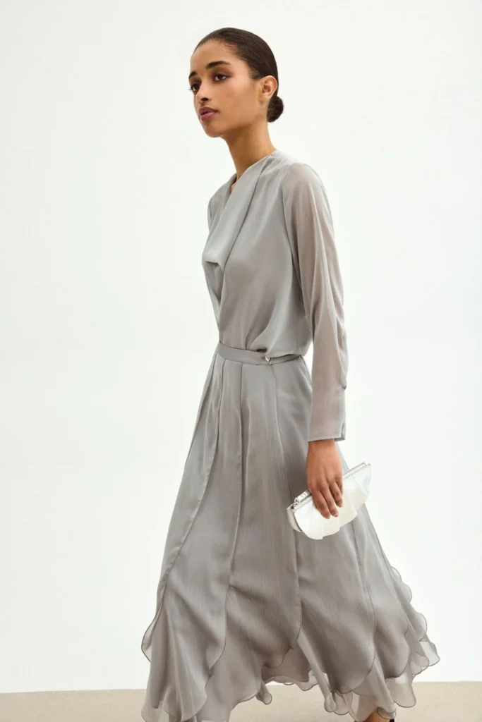 Desde el primer boceto hasta la última costura, Bimani ha convertido la practicidad en un sello de estilo. Laura Corsini, su fundadora, descubrió por casualidad el tejido que definiría la marca: un crepe georgette ligero, de caída natural y prácticamente imposible de arrugar, que prometía elegancia inmediata sin necesidad de plancha. Este descubrimiento, casi fortuito en un mercado de telas, se transformó en la piedra angular de su filosofía: prendas pensadas para la mujer moderna que exige estilo pero no quiere perder tiempo, un enfoque que se refleja en cada blusa, vestido o básico de la colección.