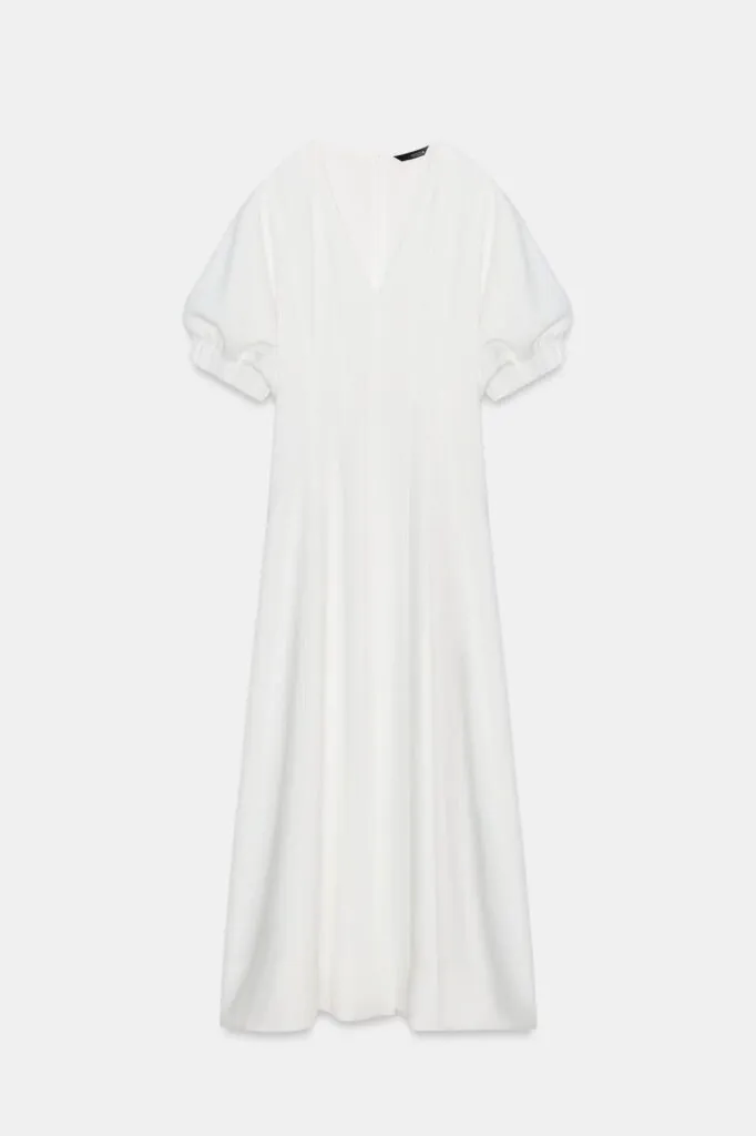 Para cerrar la selección, pero no por ello menos importante, se impone un vestido blanco de escote en pico y manga corta abullonada, un auténtico básico dentro de cualquier armario primaveral. Su corte limpio y versátil lo convierte en una pieza clave, capaz de adaptarse a múltiples situaciones sin perder estilo.