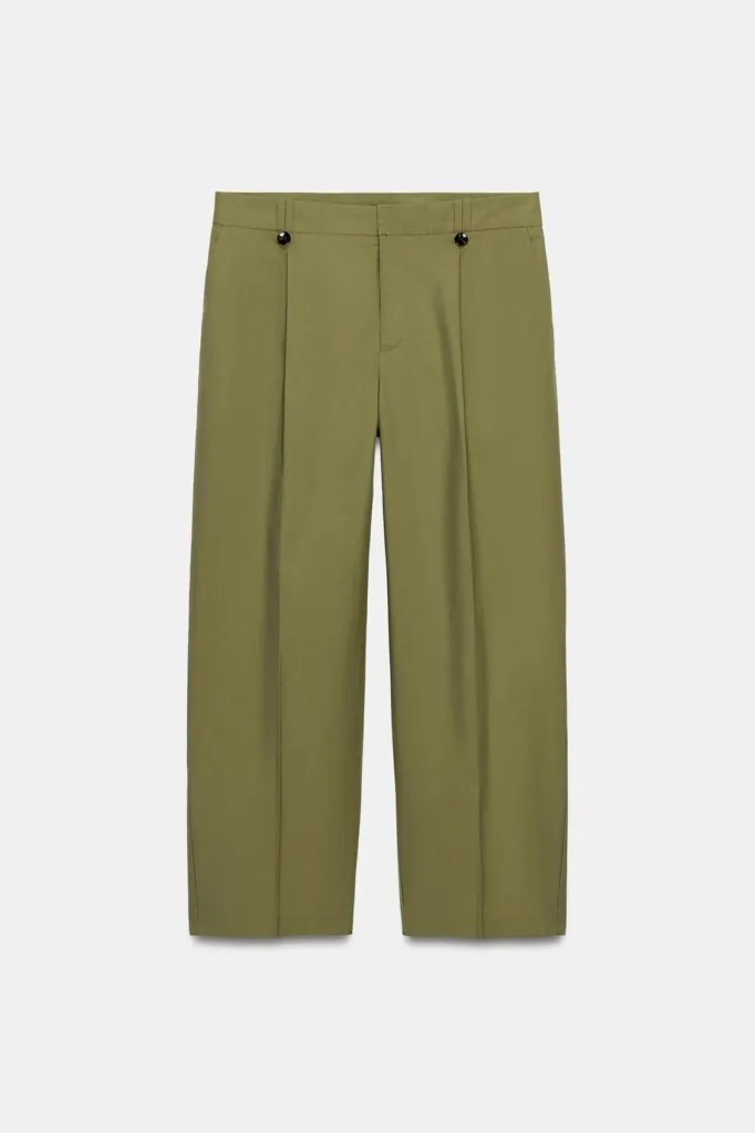 El mítico pantalón chino recto sigue siendo uno de los básicos más buscados cada temporada, y Zara lo sabe. Esta vez lo presenta en color verde oliva, un tono versátil que combina a la perfección tanto con neutros como con colores más llamativos. Con pernera recta y tiro medio, resulta cómodo y funcional, ideal para looks de diario o para la oficina.