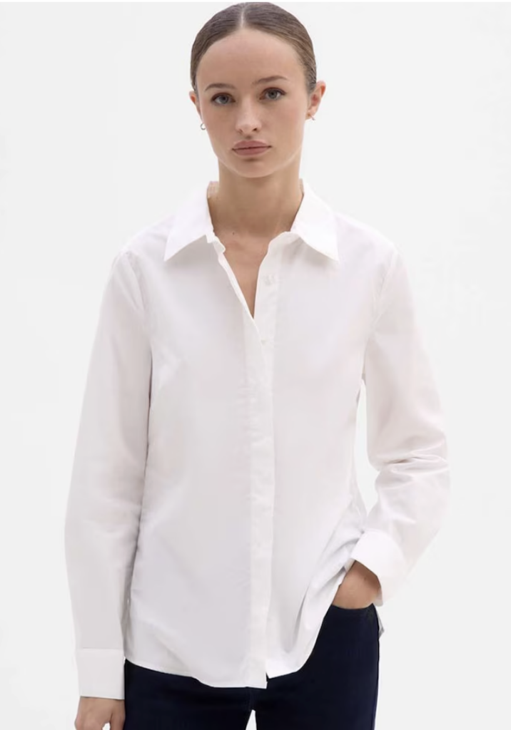 La primera propuesta apuesta por un aire pulido con guiño andrógino. Combina los culotte pants de Zara en color negro con una camisa de corte masculino como esta de Simorra, ligeramente oversize, pero bien planchada, preferiblemente en blanco, azul claro o rayas finas. La clave está en llevarla por dentro para marcar cintura y evitar que el conjunto pierda forma.