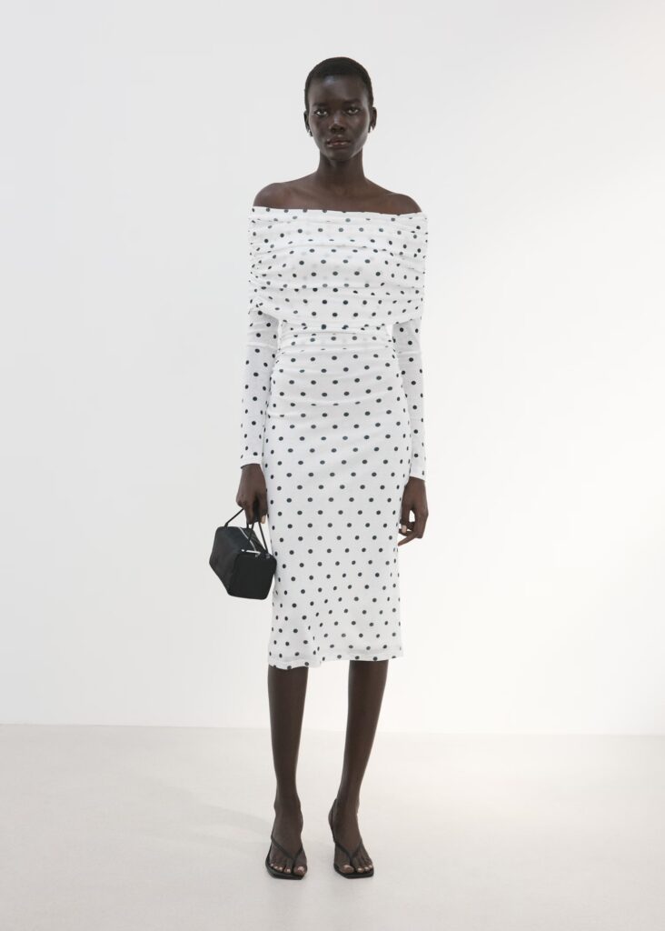 En este caso, el vestido apuesta por un diseño más entallado, con escote palabra de honor y manga larga, perfecto para esas tardes y noches en las que la brisa aún refresca, pero ya se siente la primavera. Su color blanco con lunares negros ilumina el rostro y aporta un aire de elegancia que, con solo añadir un accesorio adecuado, lo convierte en un look ideal para cualquier ocasión especial.