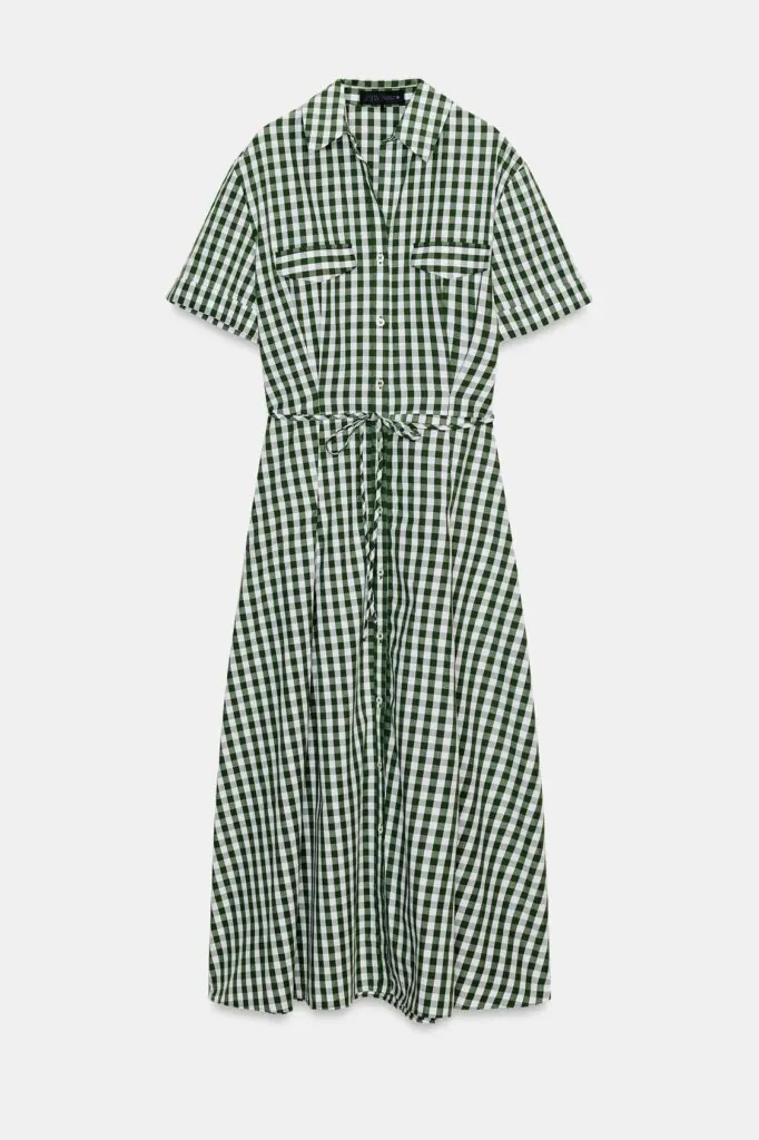 Por último, pero no menos importante, este vestido largo de cuadros en blanco y verde es perfecto para los días de diario. El cinturón en la cintura lo convierte en una pieza especial, marcando y estilizando la silueta, mientras que su corte amplio garantiza comodidad. El cierre tipo camisero lo hace ideal para esos momentos en los que no quieres ir demasiado arreglada ni formal, pero sí mantener un look cuidado y bien vestido.
