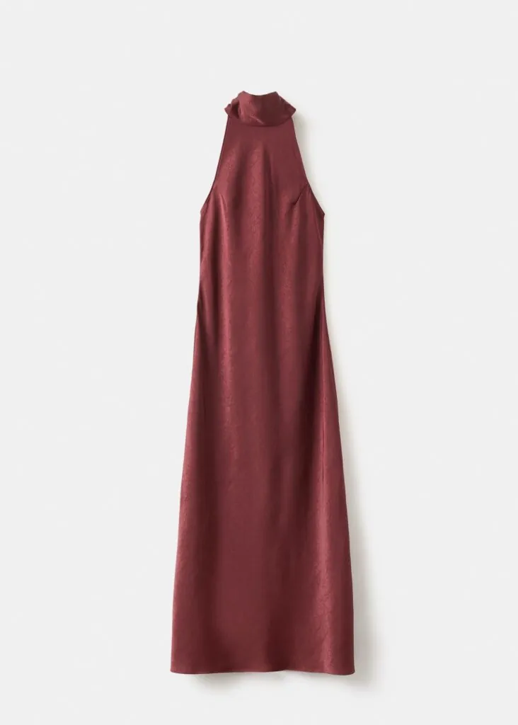 Dentro de nuestra selección también hemos incluido vestidos más especiales, como este modelo de cuello halter en tejido satinado y tono burdeos. Su acabado brillante y elegante lo convierte en una pieza que no pasa desapercibida, y lo más importante, es exclusivo de la web, así que si te ha enamorado, no pierdas tiempo y corre antes de que se agote.