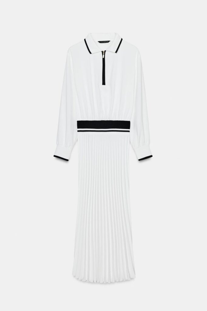 Uno de los más originales de la selección es este vestido de cuello con solapa y manga larga, que combina una falda plisada con cierre frontal de cremallera. Su estilo, ligeramente deportivo, se transforma por completo si se acompaña con los complementos adecuados: un calzado coherente, collares estratégicos y un bolso bien elegido. El resultado es un look de diario moderno y versátil, capaz de destacar sin esfuerzo, perfecto para quienes buscan comodidad sin renunciar a un toque de estilo en cualquier plan cotidiano.