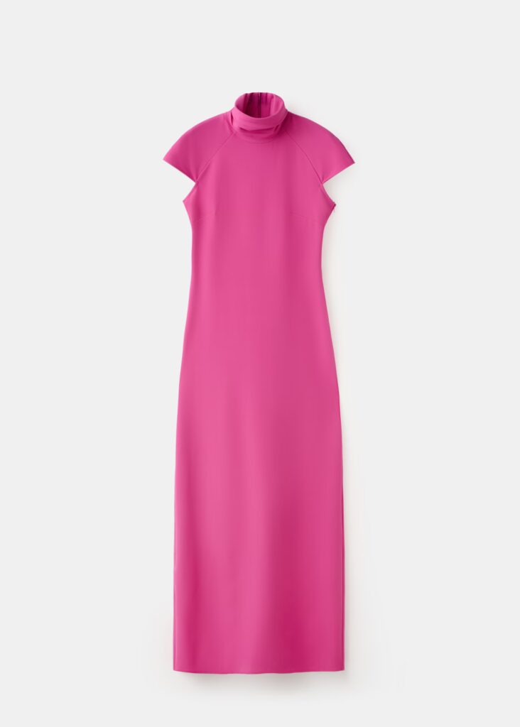 Entre los vestidos seleccionados para ocasiones más especiales, este se lleva todas las miradas. Su diseño largo, entallado y con cuello alto combina elegancia y sofisticación, mientras que la espalda abierta añade un toque inesperado y moderno. Es perfecto para esos eventos de oficina donde necesitas transmitir seguridad y profesionalismo. Solo con ponértelo y añadir joyas discretas, como unos pendientes en forma de gota y una pulsera fina, el look logra un equilibrio entre estilo y comodidad, ayudándote a sentirte confiada y proyectar seguridad en lo que vas a decir.