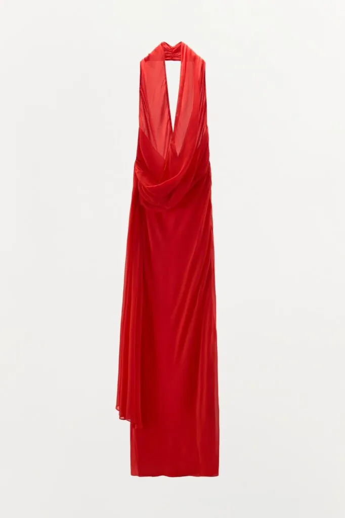 Por último, pero no menos importante, este vestido largo rojo en viscosa 100% se distingue por su fluidez y caída natural. El cuello halter y el escote pico cruzado realzan los hombros descubiertos, mientras que el drapeado en la cintura y la tira a tono en la espalda aportan un detalle refinado. Con forro interior que garantiza comodidad, se convierte en una opción elegante y ligera, perfecta para bodas de noche, y combinada con accesorios en plata u oro logra un look sofisticado y chic.