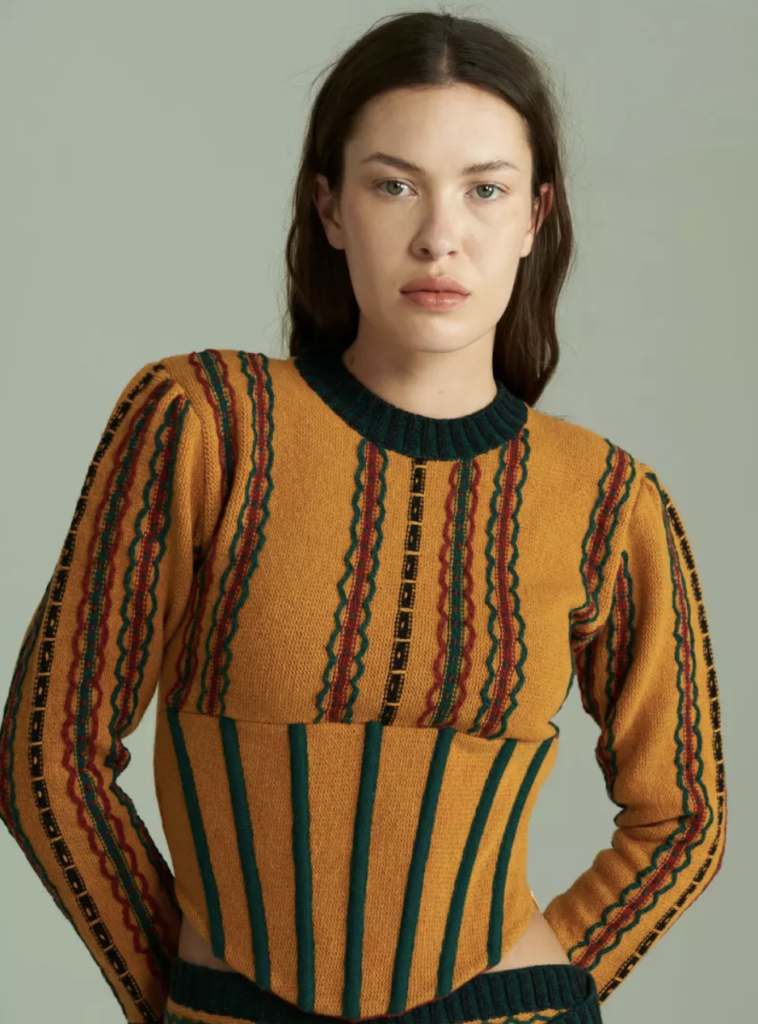 Para la parte de arriba hemos querido seguir jugando con tonos tierra, como este jersey en color mostaza anaranjado con detalles en verde oscuro y granate, perfecto para combinar con nuestros vaqueros y el tote de gran tamaño. El jersey de la marca Mutma es ideal, y lo hace especialmente especial por su textura y caída, que aportan sofisticación y comodidad al mismo tiempo.
