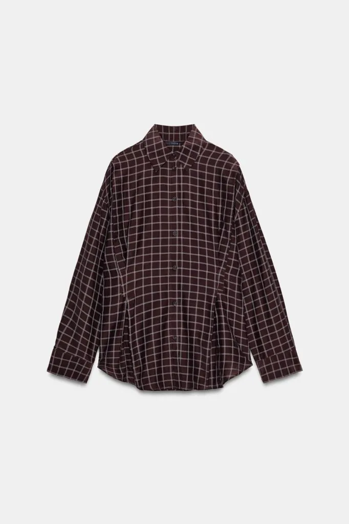 Una de las camisas que más ha llamado nuestra atención en Zara esta temporada es de cuadros y rayas, en tonos marrón y azul celeste, logrando un aire sofisticado y elegante. Su cuello elevado aporta un detalle distintivo que eleva cualquier look, convirtiéndola en una prenda versátil, perfecta tanto para ocasiones formales como para estilismos casuales con un toque chic.