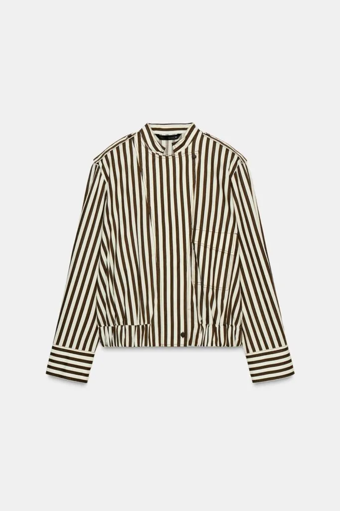 Para el protagonismo de las rayas, destaca esta camisa tipo bomber en tonos blanco roto y marrón chocolate, perfecta para llevar como sobrecamisa o por sí sola. Su cuello perkins y las mangas largas con puños rematados le aportan un detalle distintivo que la convierte en una pieza realmente especial dentro de cualquier armario de temporada.