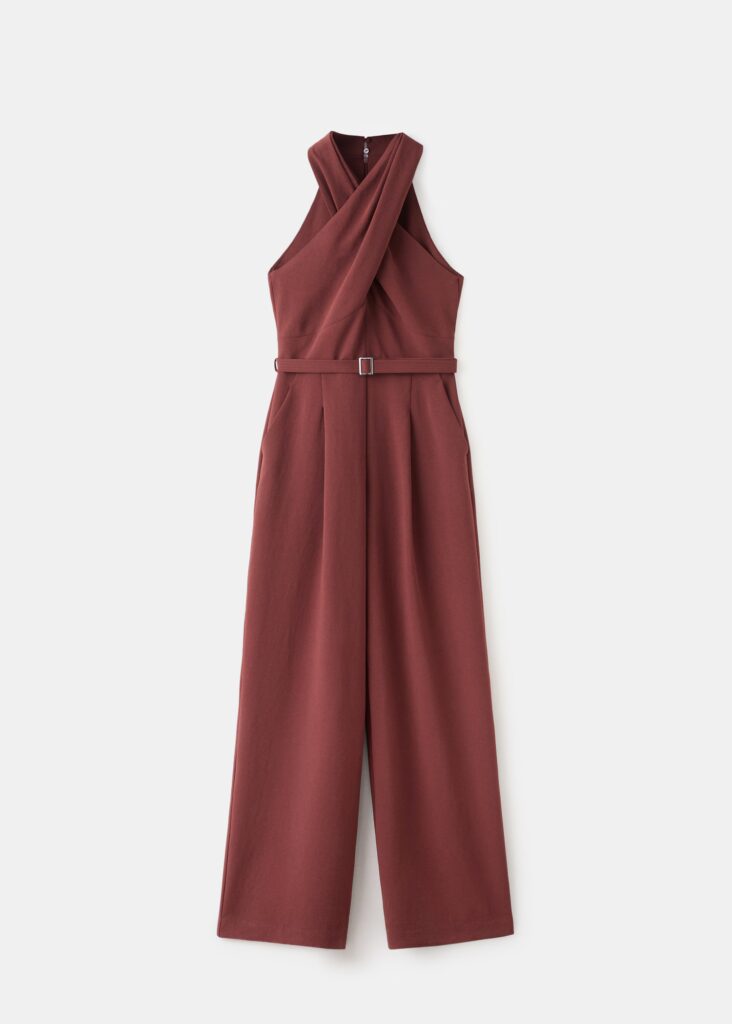 El cuello halter cruzado y el detalle del cinturón marcando la cintura aportan estructura y elegancia al conjunto. No es casualidad que forme parte de la colección de fiesta y eventos de la firma, pensada precisamente para este tipo de ocasiones especiales. A esto se suma un tono granate profundo que se acerca al marrón chocolate, una mezcla sofisticada que encaja a la perfección con las celebraciones de primavera.