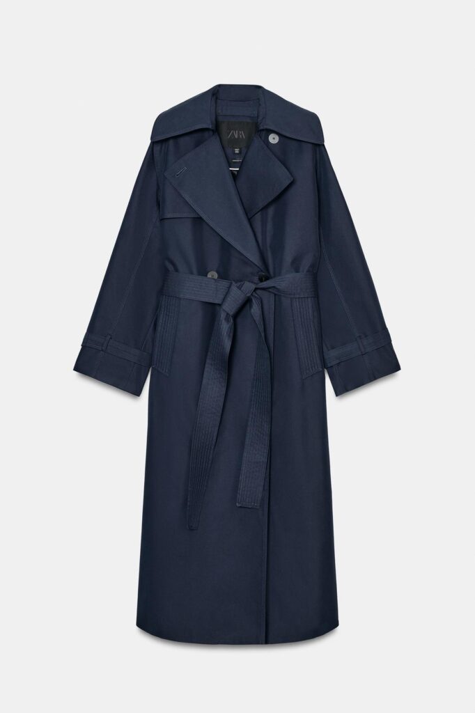 Por último, pero no menos importante, la gabardina en azul marino de Zara se consolida como otro básico imprescindible que no podía faltar esta temporada. Con cuello de solapa y mangas largas ajustables con trabillas, se adapta tanto al día a día como a ocasiones más formales. Su versatilidad permite combinarla con zapatillas blancas para un look casual o con stilettos para un estilismo más sofisticado, convirtiéndola en una pieza clave capaz de elevar cualquier conjunto con facilidad.