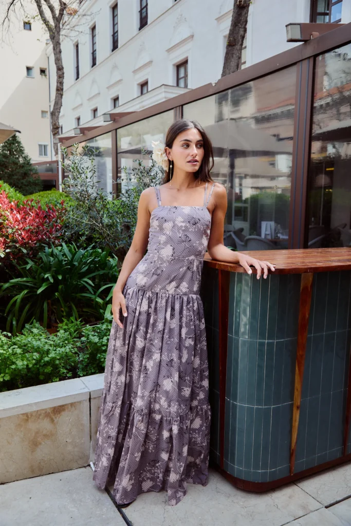 El tejido ligero, cómodo y delicadamente estampado en un lila suave con motivos florales, lo convierte en una opción versátil que acompaña con estilo desde las primeras bodas primaverales hasta los últimos eventos del otoño, consolidándose como un must en el armario de cualquier amante de la moda española.