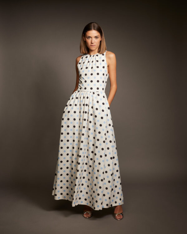 El vestido de Artola con estampado de lunares es un guiño moderno a la feminidad clásica. Confeccionado en crêpe ligero, su cuello halter y la espalda descubierta aportan un aire fresco y sofisticado, mientras que los bolsillos incorporan un detalle práctico que no sacrifica estilo. La silueta fluida y el patrón de lunares convierten a esta pieza en un básico versátil para invitadas que buscan combinar comodidad, movimiento y un toque de encanto atemporal.