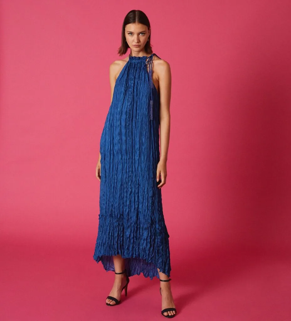 El vestido de Simoora en azul se presenta como una propuesta sofisticada y artesanal para las invitadas más exigentes. Su escote halter realza la silueta con un aire moderno, mientras que los delicados pompones de pedrería al tono aportan un toque de brillo sutil, casi poético.