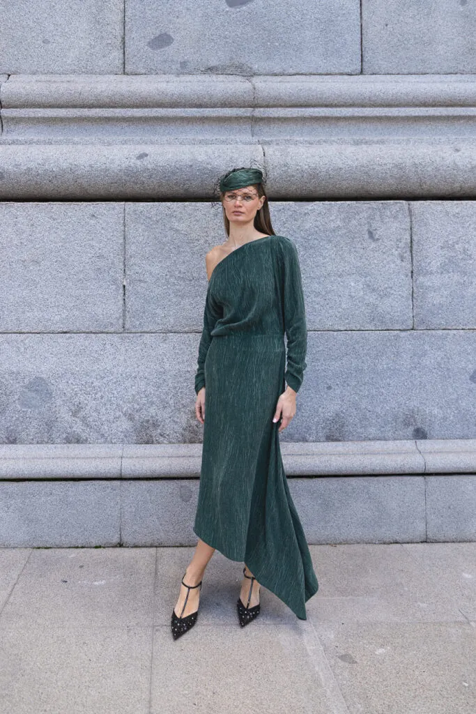 La caída ligera de la falda genera un movimiento delicado, equilibrando estructura y ligereza con un aire contemporáneo. De líneas depuradas y estética atemporal, se presenta como una opción perfecta para invitadas que buscan un look femenino y refinado sin artificios, además de llevar consigo el valor de la producción íntegramente española.