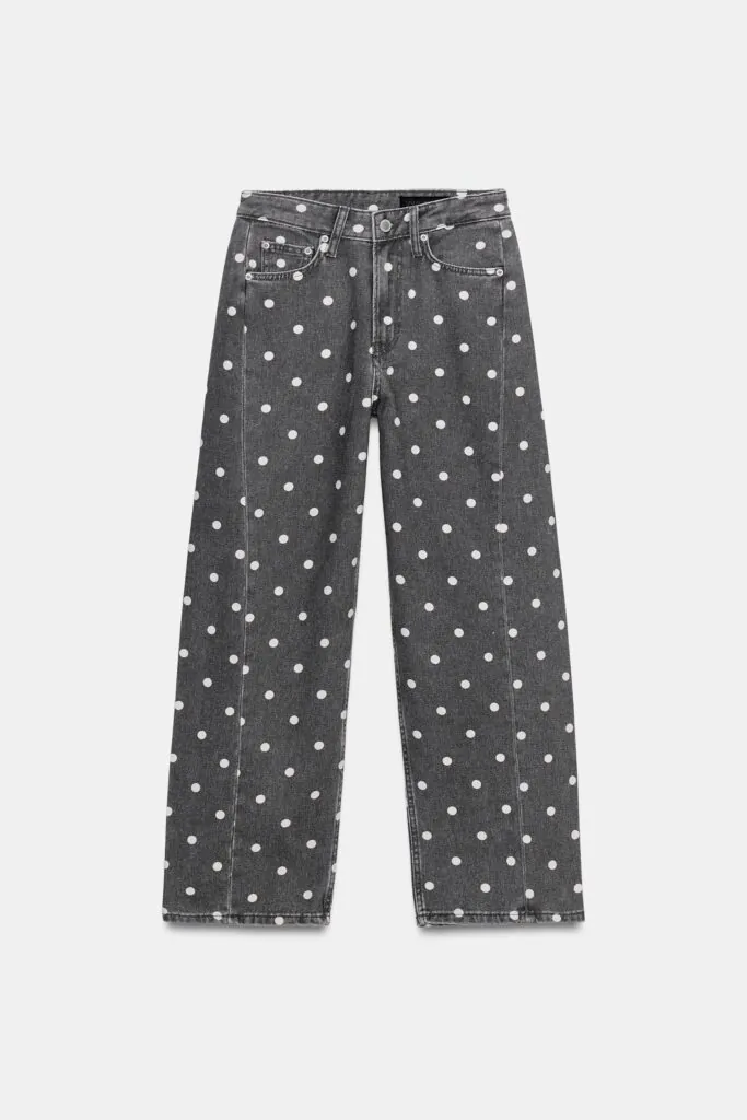 En Zara destaca la apuesta por los jeans de tiro medio con cintura con trabillas y estampado de lunares, una reinterpretación juguetona del clásico denim. Esta versión aporta un giro gráfico que dialoga con la tendencia maximalista que vemos en blusas vaporosas y accesorios XXL. Perfectos con camisetas blancas y sandalias planas o con blazers estructuradas para un look urbano cuidado sin esfuerzo.