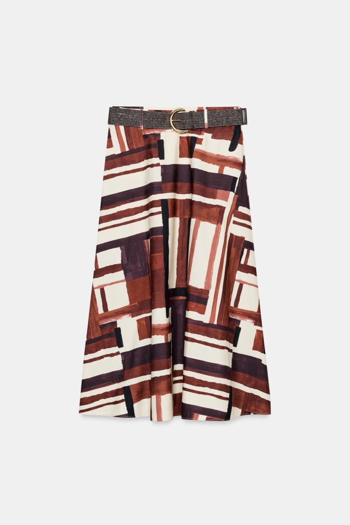 Esta falda de popelín de tiro alto combina estructura y estilo, acentuada por un cinturón que define la cintura con precisión. Su bajo en evasé aporta fluidez y movimiento al caminar, mientras el cierre lateral con cremallera oculta en la costura garantiza una silueta limpia y sofisticada, convirtiéndola en un imprescindible versátil para la temporada.