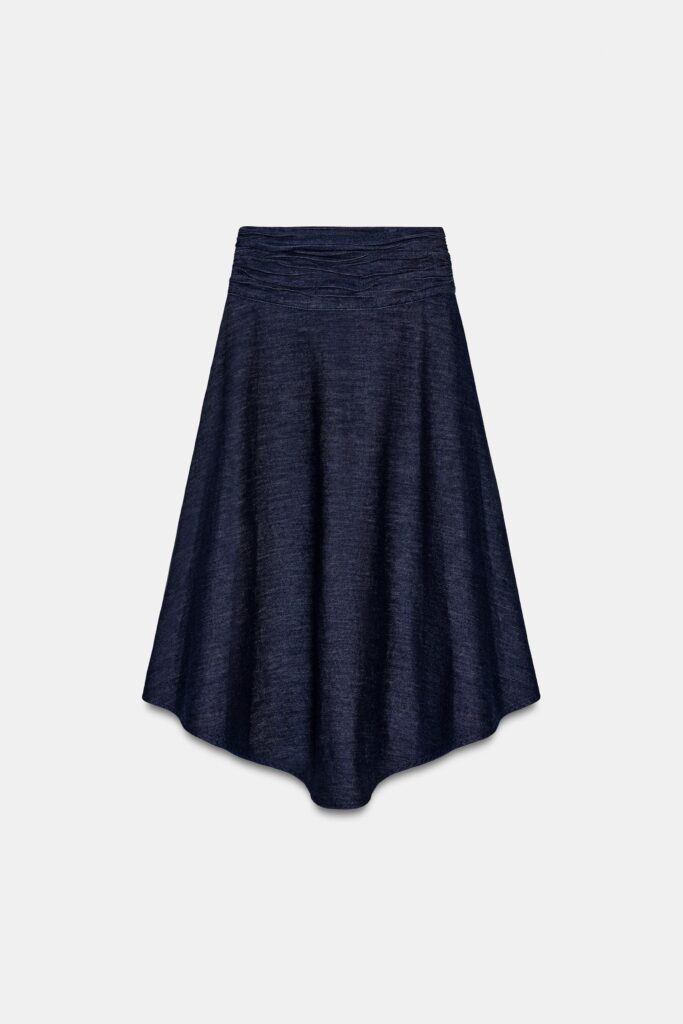 La falda de tiro alto se reinventa con un juego de frunces que aporta volumen estratégico, mientras su bajo asimétrico introduce un toque moderno y dinámico al look. El cierre lateral con cremallera oculta en la costura garantiza una silueta limpia y depurada, fusionando elegancia y funcionalidad en una pieza que se perfila como imprescindible para la primavera.