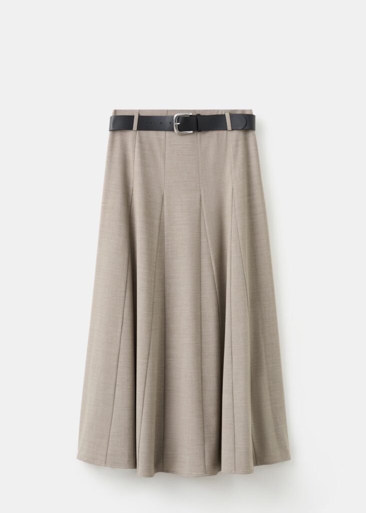 Esta falda larga de corte evasé destaca por su movimiento elegante y femenino, potenciado por el detalle de godets que aportan dinamismo al diseño. El cinturón con cierre de hebilla y las trabillas definen la cintura con sofisticación, mientras el tiro medio y el forro interior aseguran comodidad y un ajuste impecable, convirtiéndola en una pieza versátil para transitar de la oficina a eventos más informales con estilo.