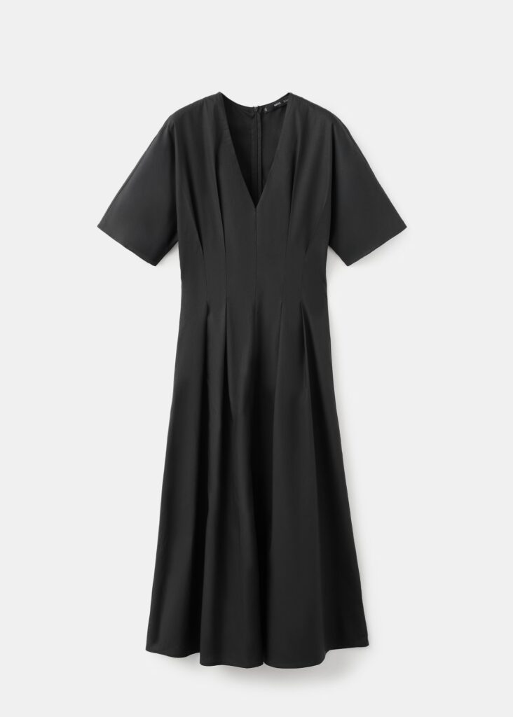 Mango tiene en sus colecciones un vestido negro básico que al final siempre es un must en cualquier armario por su capacidad de adaptarse a múltiples ocasiones. Su corte evasé y largo le da movimiento y feminidad, mientras que los detalles fruncidos y el cuello en pico aportan un toque de sofisticación sin complicar el conjunto.