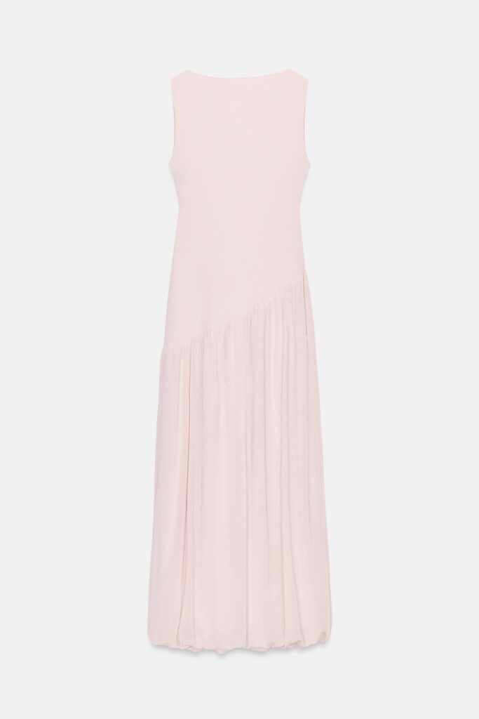 Inditex lanza un vestido de cuello redondo y manga sisa, concebido para brillar en cualquier evento formal, su silueta fluida en un delicado tono rosa pastel pide ser acompañado de accesorios que hablen de tu personalidad, desde unos pendientes audaces hasta un clutch que marque la diferencia, porque en la moda, los detalles cuentan tanto como la prenda.