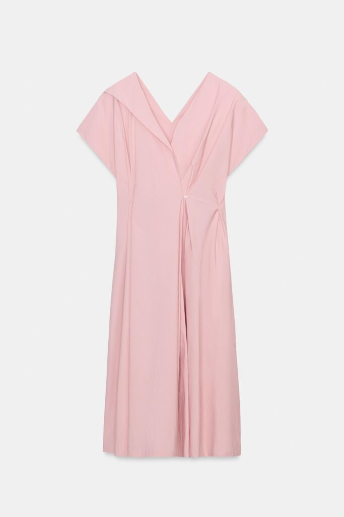Por último, en un rosa pastel más intenso, este vestido confeccionado en hilatura con viscosa, con bajo recto fluido y un tejido ajustable con lazada, está diseñado para destacar con elegancia, aportando un toque chic que combina sofisticación y modernidad en cada detalle.