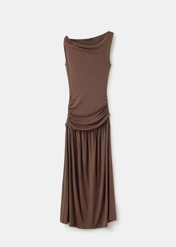 Vestido midi con silueta evasé, cuello asimétrico y sin mangas, con un delicado frunce en el hombro y cierre lateral. Disponible en tallas Plus, forma parte de la colección de fiesta de Mango, pensado para brillar en cualquier ocasión especial.