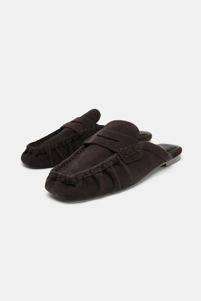 El zapato tipo mocasín destalonado en piel en color marrón oscuro de Zara se presenta como una versión renovada del clásico, donde el detalle fruncido en la parte delantera añade textura y movimiento, mientras que el copete subido y el antifaz aportan un aire de sofisticación discreta. La punta redonda suaviza la silueta, equilibrando elegancia y comodidad en un diseño que funciona tanto para el día a día como para ocasiones más formales. Y es que se puede combinar con cualquier tipo de preda.