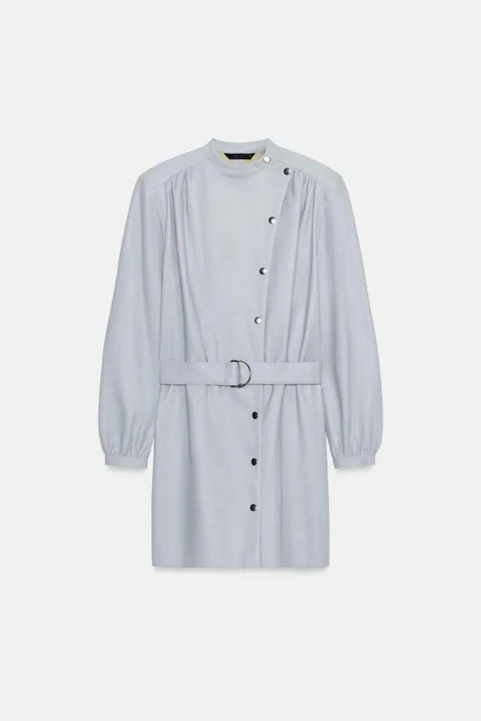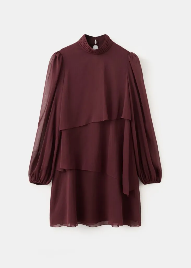Vestido corto con un toque romántico gracias al volante, cuello delicadamente drapeado y mangas largas que terminan en puños abullonados. Ideal con botas charol en un tono marrón.