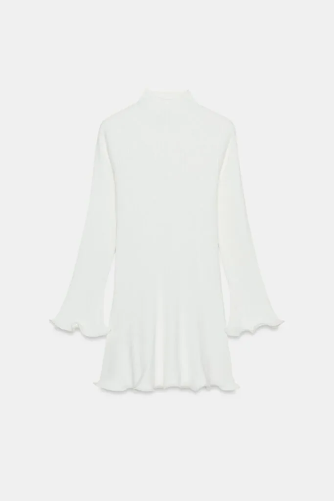 Vestido corto en blanco, de cuello subido y manga larga, con delicados acabados ondulados que le dan un aire sofisticado. Se puede combinar de forma muy elegante con botas negras o marrones; si se añade una bomber aporta un toque urbano, mientras que con una blazer se consigue un look más profesional.