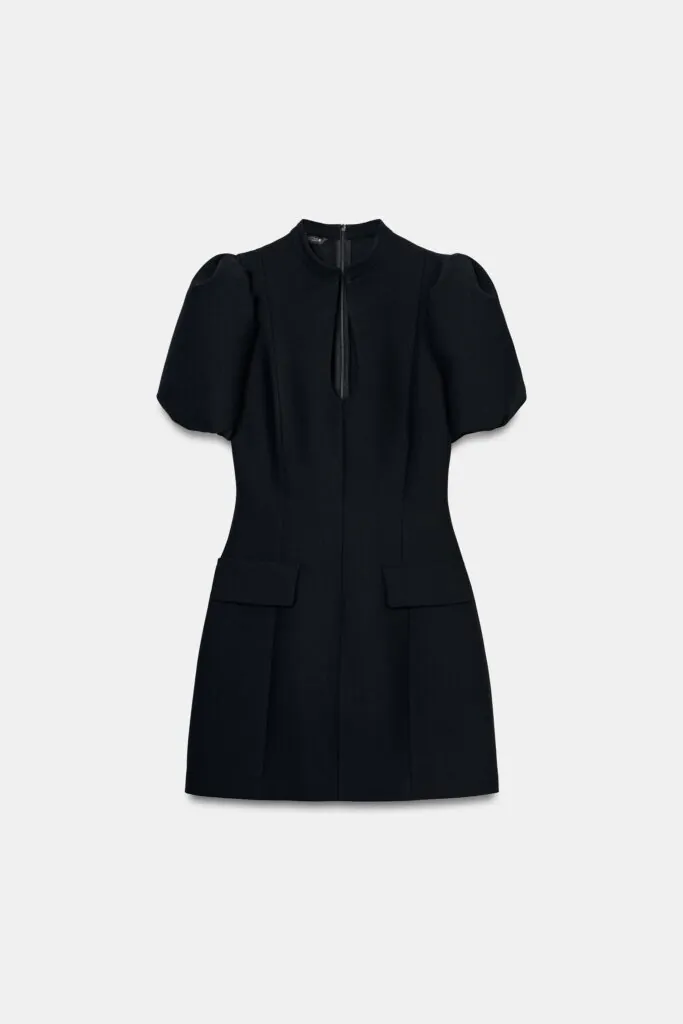 Vestido de cuello redondo con escote en pico y mangas cortas abullonadas, que marca la cintura para realzar la silueta. Cuenta con tapetas delanteras y cierre oculto en la espalda. Perfecto para combinar con unas botas negras, aportando un estilo sofisticado y lleno de carácter.