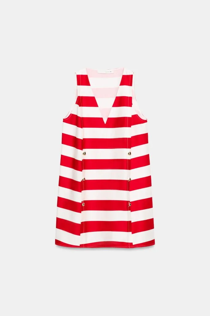 Vestido de escote en pico y manga sisa, con falsos botones delanteros, en un llamativo estampado de rayas rojas y blancas. Es perfecto para esas ocasiones en las que apetece salir de lo habitual y apostar por un look con personalidad. No es un básico de fondo de armario, pero basta con tener uno para esos días en los que buscas un estilo más original y diferente.