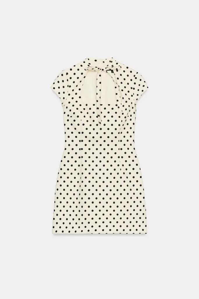 Vestido corto con cuello redondo y una lazada que le da un aire femenino, escote cuadrado y manga corta. Una prenda muy especial que con unas botas negras y un bolso clutch es ideal para una noche de amigas en Semana Santa.