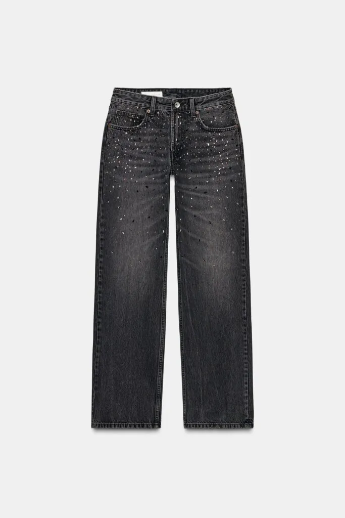 Otro modelo que merece un lugar en el armario es el vaquero con aplicaciones de strass, discretas pero con personalidad. Y es que cuando buscamos construir looks sobre una base de fondo de armario, incorporar una pieza que se salga ligeramente de lo convencional aporta un guiño de originalidad sin perder la esencia del denim. Sigue siendo un jean, pero transformado en un lienzo más personal, pensado para quienes quieren un toque de atrevimiento en su estilo, sin renunciar a la versatilidad que caracteriza a las piezas clave.