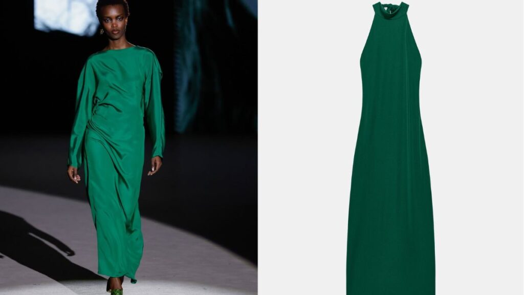 El vestido de Zara refleja con claridad la esencia del diseño de Malne, capturando la misma filosofía de minimalismo sofisticado que domina las pasarelas contemporáneas. Y es que la silueta fluida y la caída ligera, junto con el cuello halter que se anuda en la nuca, reproducen la elegancia estructural y el aire arquitectónico del original, adaptándolo a un lenguaje ready‑to‑wear.