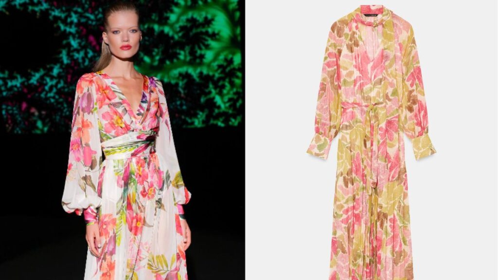 El cuello con lazo y las mangas largas conservan el dramatismo y el romanticismo de las mangas obispo, y el forro interior asegura comodidad sin sacrificar la ligereza de la prenda. En conjunto, Zara consigue trasladar la explosión de color y el glamour bohemio a una propuesta accesible que mantiene la esencia del escapismo estival de la pasarela.
