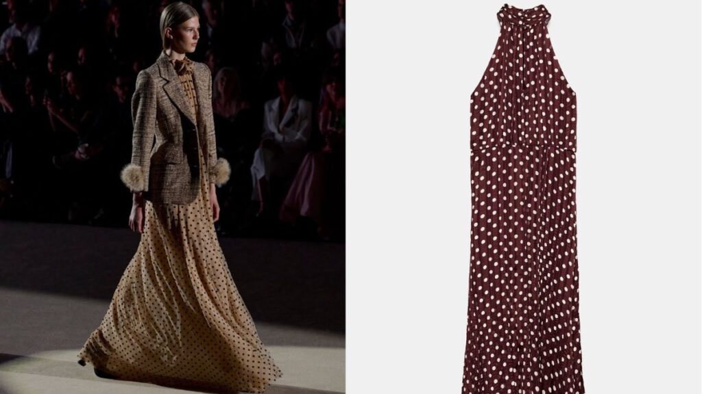 La versión de Zara toma la esencia del vestido de Simorra y la hace más accesible. Mantiene el escote en V y la silueta envolvente, mientras que las mangas ligeramente voluminosas y el cinturón con hebilla imitan el detalle del broche original, dando un toque de glamour vintage. Los frunces ayudan a dar forma y movimiento a la prenda, mostrando cómo la marca adapta la elegancia y el estilo del lujo artesanal a un vestido cómodo y fácil de llevar cada día.