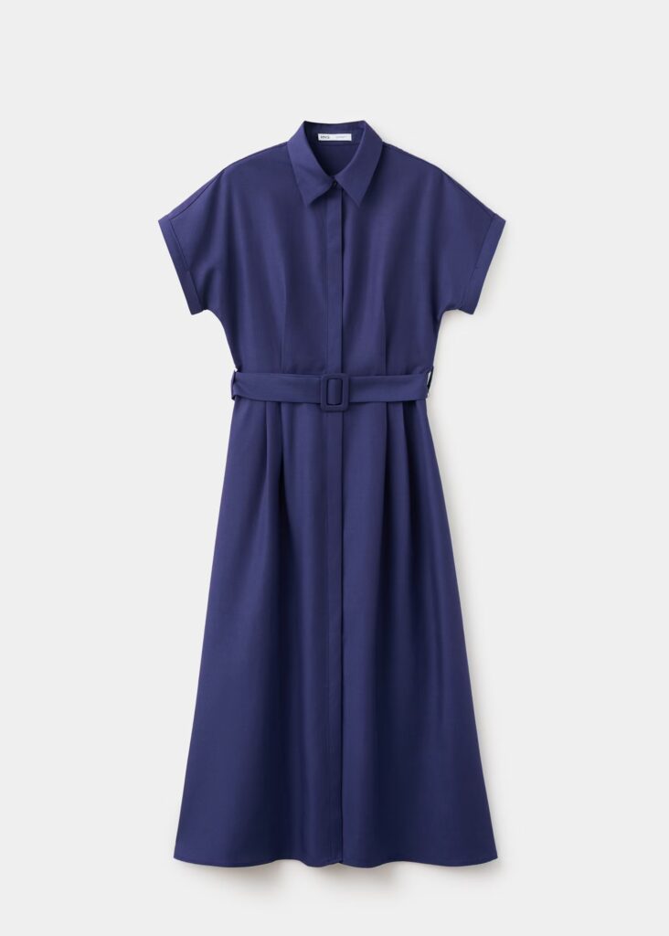 El vestido largo en mezcla de lino y lyocell, en un elegante azul marino, se consolida como un básico versátil para el día a día y la oficina. Su diseño evasé, cuello camisero y manga corta ofrecen comodidad sin perder sofisticación, mientras que las trabillas y el cinturón en la cintura permiten ajustar la silueta con delicadeza.