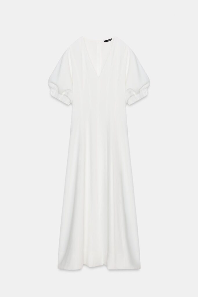 El vestido blanco con escote en pico y manga corta abullonada se convierte en un básico sofisticado para la oficina. La cintura elástica define la silueta, mientras que el bajo en evasé con abertura frontal aporta ligereza y movimiento. El cierre posterior con cremallera oculta mantiene la línea depurada del diseño.