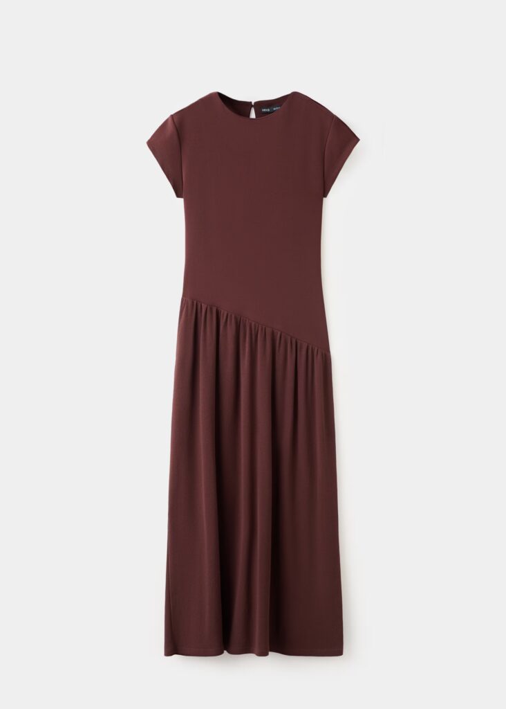 El vestido midi en tono marrón chocolate se presenta como un esencial para un look de oficina sofisticado y minimalista. Su corte asimétrico y la manga corta aportan movimiento y modernidad, mientras que el cierre en forma de lágrima en la espalda añade un detalle inesperado y elegante.
