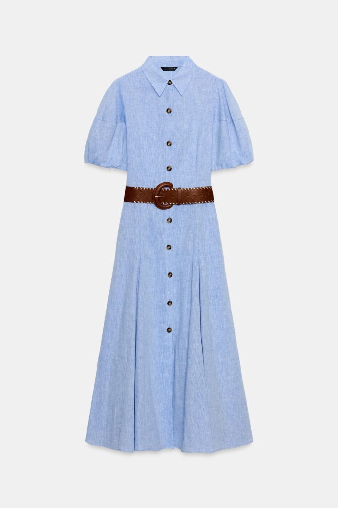 El vestido, elaborado en lino fresco, se impone como la opción ideal para los días de primavera en la oficina. Su cuello de solapa y la manga corta abullonada con detalle elástico aportan un aire delicado y femenino, mientras que el cierre frontal con botones y el cinturón definen la silueta con sutil elegancia.