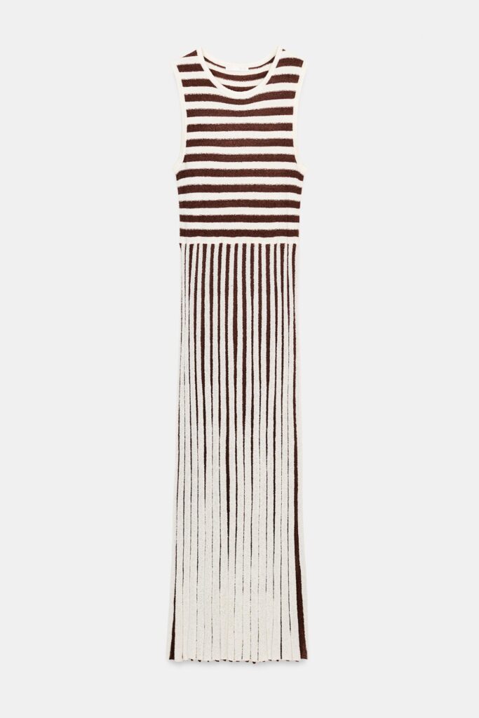 El vestido largo de cuello redondo y manga sisa, confeccionado en un tejido con textura y bajo plisado, se impone como una pieza versátil y elegante para la oficina. Su caída fluida y los detalles plisados aportan movimiento y sofisticación, mientras que la combinación con unas cuñas de esparto con tacón o unas zapatillas blancas permite alternar entre un estilo más formal o casual. Completado con una blazer estructurada, el conjunto alcanza un equilibrio perfecto entre chic y profesional, ideal para quienes buscan un look primaveral con presencia y personalidad.